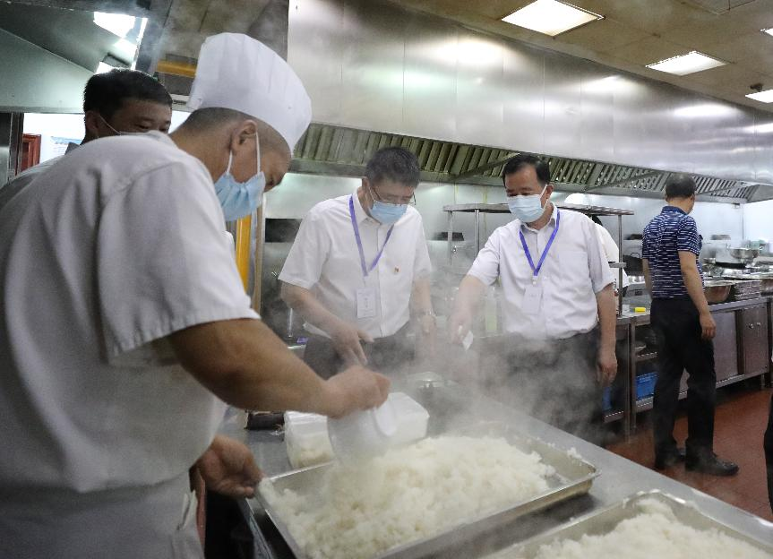檢查過程中,葉善祥聽取了長樂客棧負責人關于疫情防控工作匯報,詳細了解封閉管理期間滯留旅客和防疫人員的住宿和三餐安排,以及他們的核酸檢測情況。他指出,要落實好食品安全管理,嚴把食品安全關,提倡無接觸收貨,加強庫存食品安全管理,及時清理過期變質的食品和原料;要落實好環境衛生管理,每日做好公共區域、餐飲區域消殺,嚴格餐具衛生管理,強化無接觸送餐,用餐結束后對所有餐具進行全方位的清潔和消毒;要落實好人員管理,做好宣傳以及心理疏導工作,切實關心封閉管理人員的心理和生活,做好后勤保障。