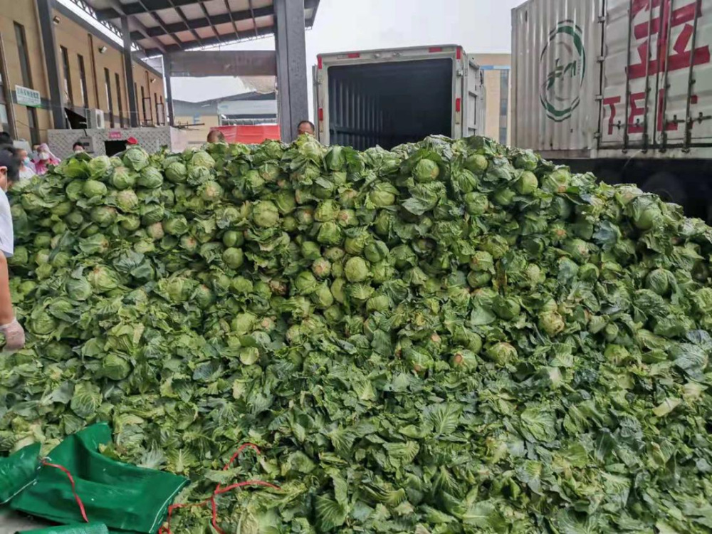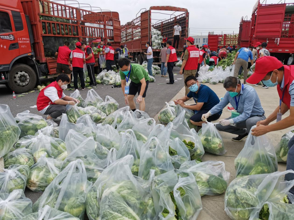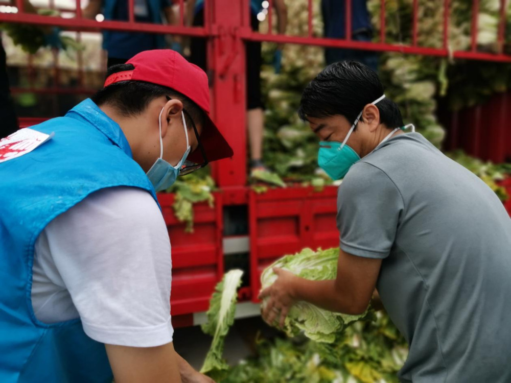 由于蔬菜數量龐大,為保障居民能夠及時拿到“愛心菜”,13:30,城控集團又從各志愿服務小組緊急抽調50名志愿者奔赴萬噸冷鏈進行現場支援。