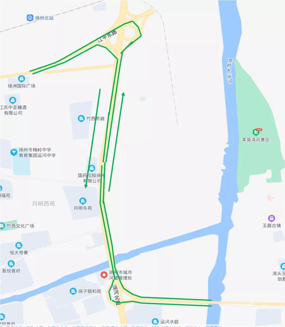 運河快速路江廣互通以北段全長4.1公里,雙向六車道、時速80公里,在北城路設置匝道。本次開通路段為運河快速路江廣互通以北段高架主線及江運互通高架主線。目前從北往南方向,從江平快速路右轉經(jīng)過江運互通可至運河快速路高架,經(jīng)江廣互通左轉至江廣快速路,可前往萬福大橋、揚州東站;從南往北方向:從江廣快速路至江廣互通后右轉,經(jīng)運河快速路右轉經(jīng)過江運互通,左轉可至江平快速路。另外,北城路上下運河快速路的4個匝道封閉。