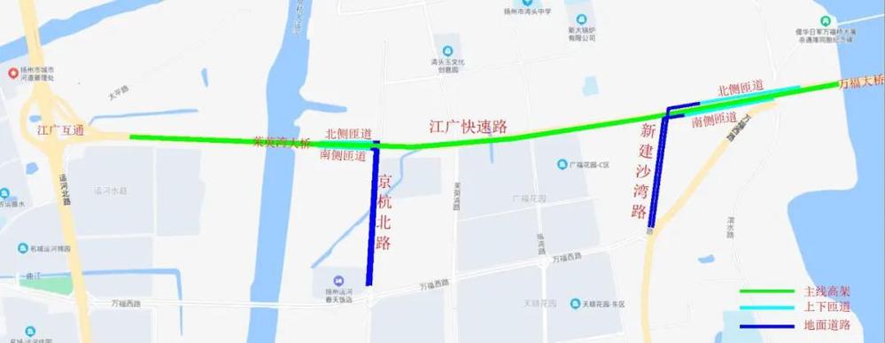 江廣快速路西起江廣互通,東至萬福大橋,均為新建,全長3.152公里,雙向六車道、時速80公里,在沙灣北路及京杭北路設置2對平行式匝道。此次開通路段為江廣快速路全線高架及平行匝道,通過江廣快速路可快捷連通運河快速路與萬福大橋,形成連接江都區(qū)與廣陵區(qū)的快速通道,同時方便市民至揚州東站乘坐高鐵出行。從萬福大橋或運河快速路進入江廣快速路的車輛也可以通過新建沙灣路或者京杭北路設置的上下匝道口進入萬福西路。