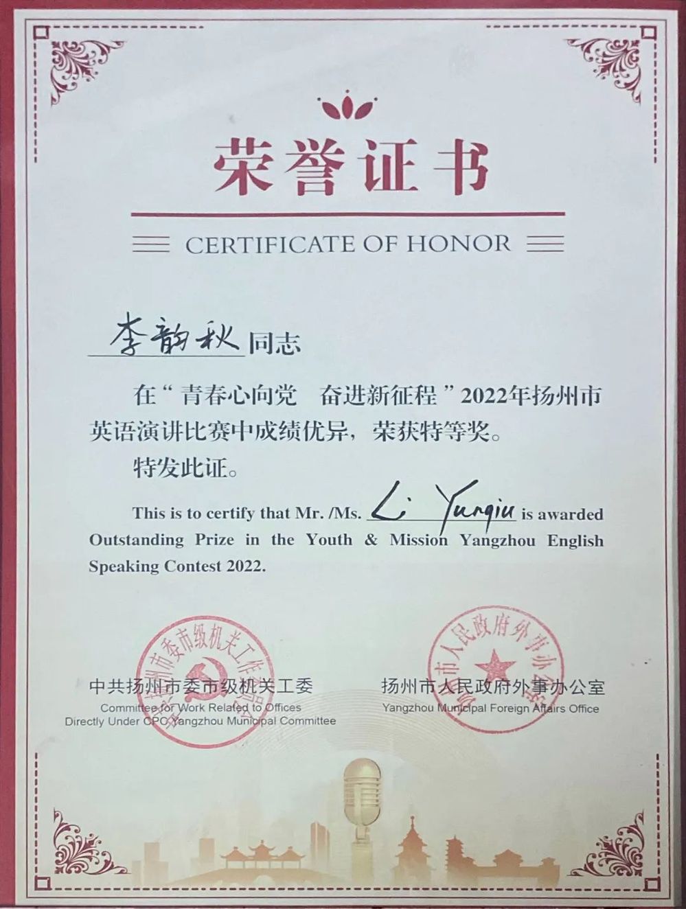 8月20日上午,在揚州市委市級機關(guān)工委與揚州市人民政府外事辦公室聯(lián)合舉辦的“青春心向黨,奮進新征程”2022年揚州市英語演講比賽決賽中,城控集團本部李韻秋同志和建盛公司張輝同志分別榮獲特等獎和優(yōu)秀獎。