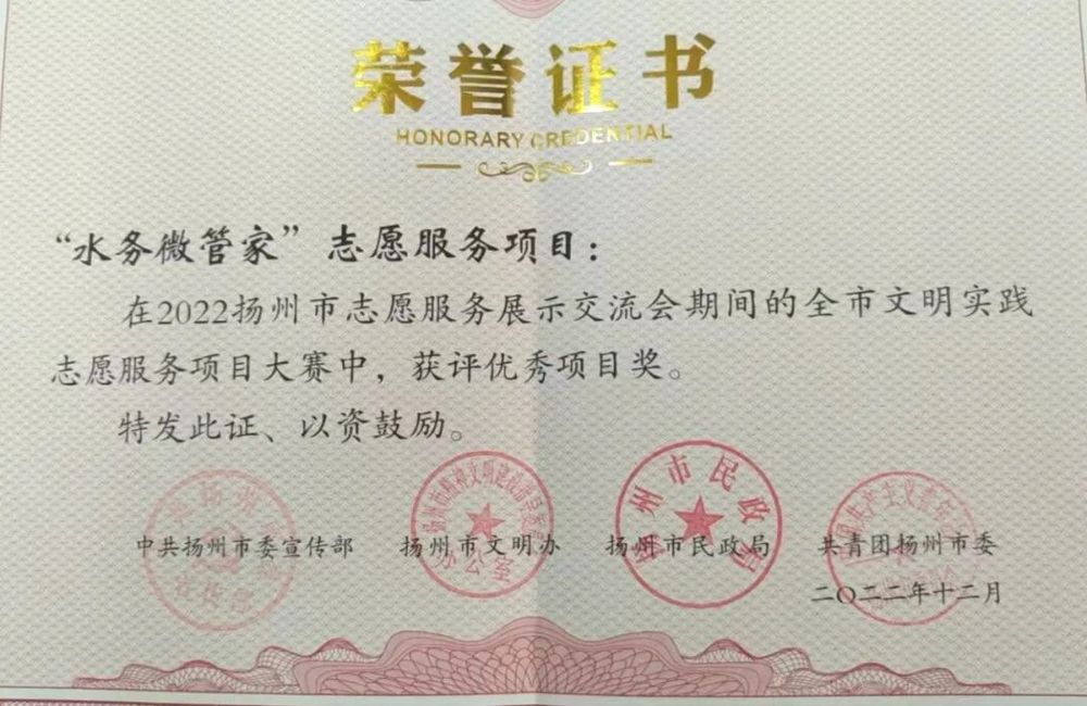 在2022年揚州市志愿服務展示交流暨文明實踐志愿服務項目大賽中,長江水務“水務微管家”志愿服務項目脫穎而出,被市委宣傳部、市文明辦、市民政局、共青團揚州市委評為優秀項目獎。