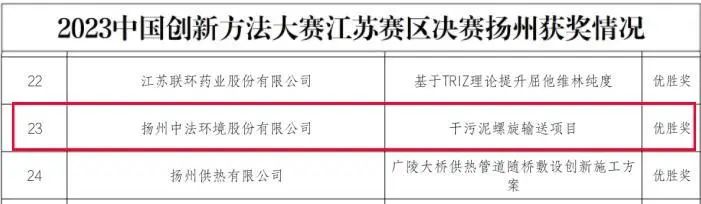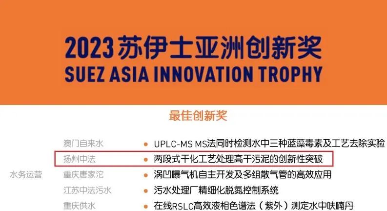 近日,揚(yáng)州中法環(huán)境“兩段式干化工藝處理高含固率污泥”項(xiàng)目因創(chuàng)新程度高、實(shí)用性強(qiáng)等特點(diǎn)獲得了中國創(chuàng)新方法大賽優(yōu)勝獎和2023年度蘇伊士亞洲最佳創(chuàng)新獎。