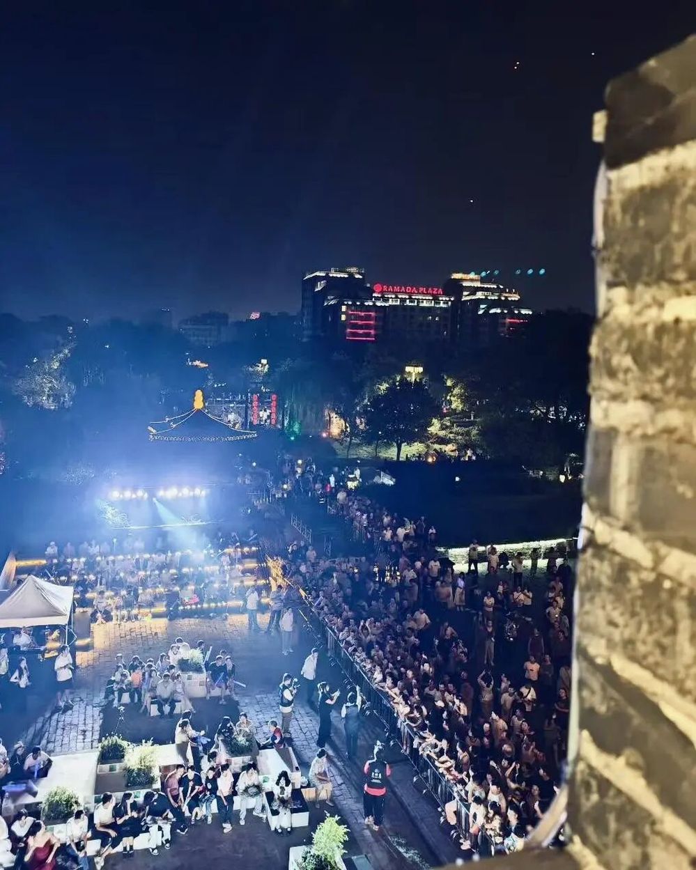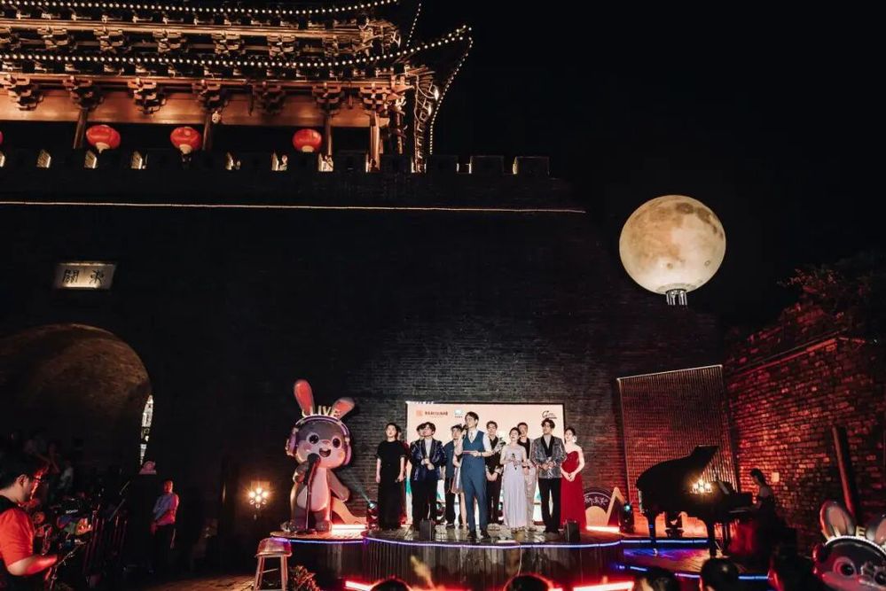 傍晚六點半,音樂會在主持人熱情洋溢的開場中拉開帷幕。在介紹完活動 “文旅賦能、文化碰撞、空間創(chuàng)新”的核心理念與到場嘉賓后,“紙鳶叩月?啟幕盛典” 儀式成為全場首個高潮——嘉賓們共同執(zhí)起 “時光之鑰”,叩響象征古今交融的 “時光月門”。伴隨主題旋律奏響,系著熒光絲帶的大紙鳶從東關城樓緩緩升空,嫦娥舞者輕盈起舞,冷焰火瀑布傾瀉而下,光影與音樂交織,瞬間將千年甕城化作連接歷史與當下的 “音樂劇場”,正式宣告 “樂下東關” 微 Live 時光音樂會啟航。